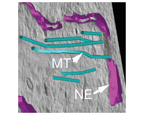 Electron tomography is an electron microscopy technique for obtaining a 3-D structural information. Images from regular utltrathin EM sections (100-150 nm) are collected at different tilt angles with the transmission electron microscope and this information is reassembled to yield a 3-D information. Reconstruction of this information is dependent on the use of Fourier-transformation algorithms and back projection. We currently using a 120 kV microscope for that purpose, using FEI-explorer software in combination with eTOMO ad IMOD, programs for reconstruction and modeling, respectively.