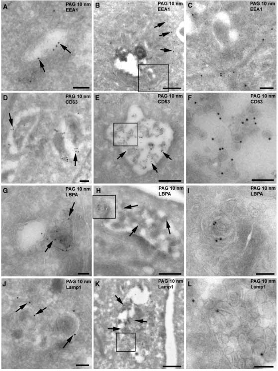 We employ two different methods for immunolabelling. The first one involves Cryo embedding, sectioning and labeling, while the second one is pre-embedding labelling where cells are grown on cover slips and the immunolabelling is performed on the whole cells before standard epon embedding.