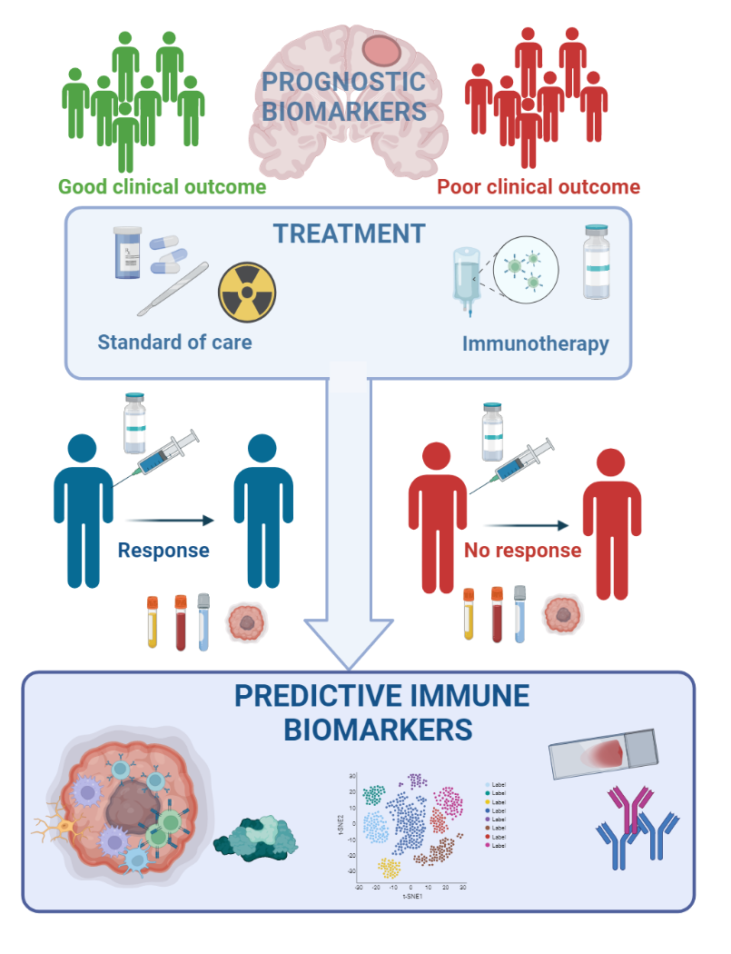 Immunotherapy has shown clinical benefits in several solid cancers; still, glioblastoma remains very challenging to treat. Glioblastoma is the most frequent brain cancer and displays great heterogeneity. The standard of care has remained the same for over fifteen years, and to overcome the therapeutic limitations, emerging immune correlates of therapy responses and improved prognosis should be further developed for a more personalized therapy approach and increased clinical responses.