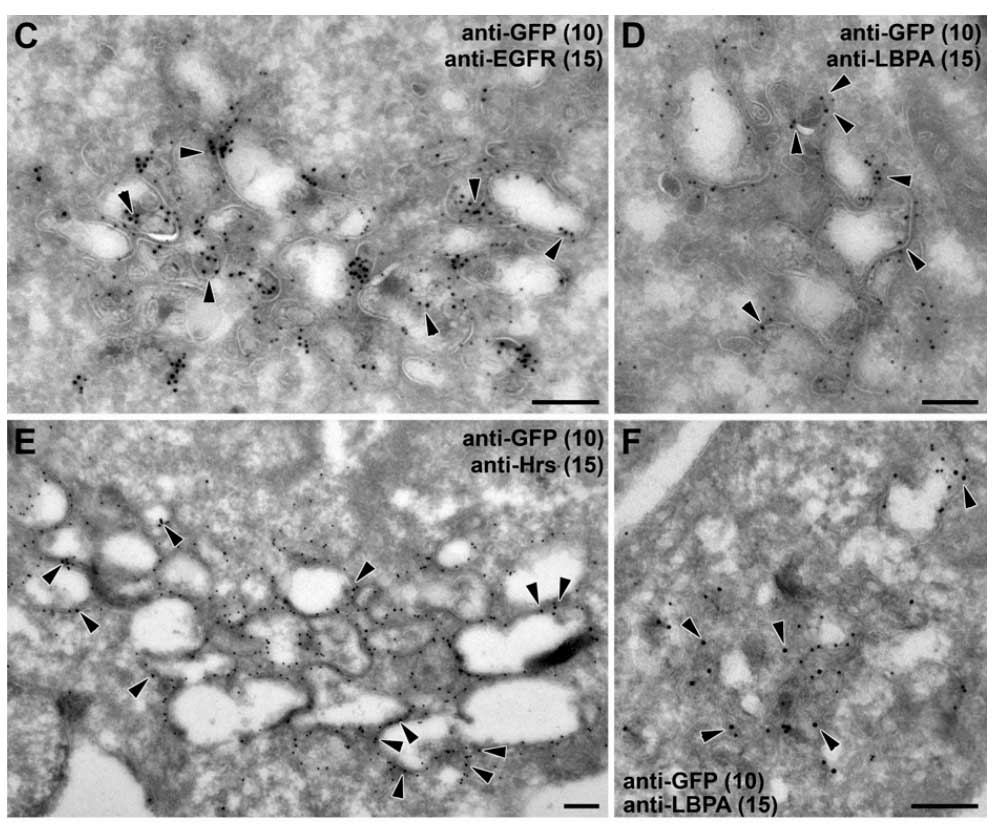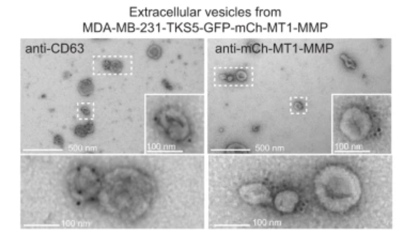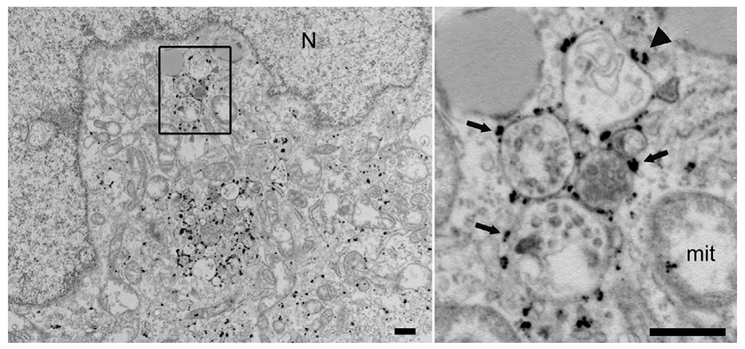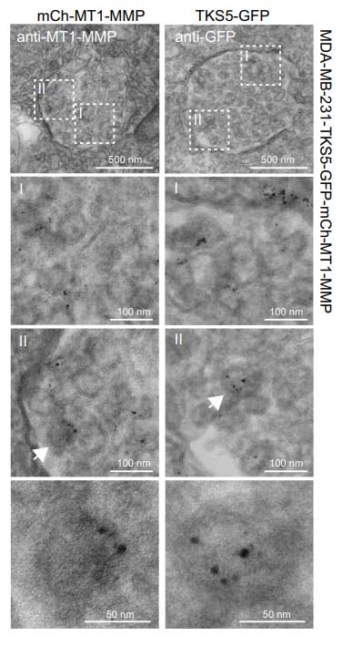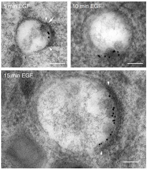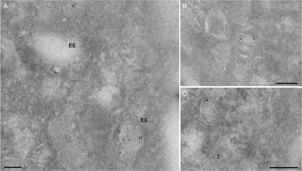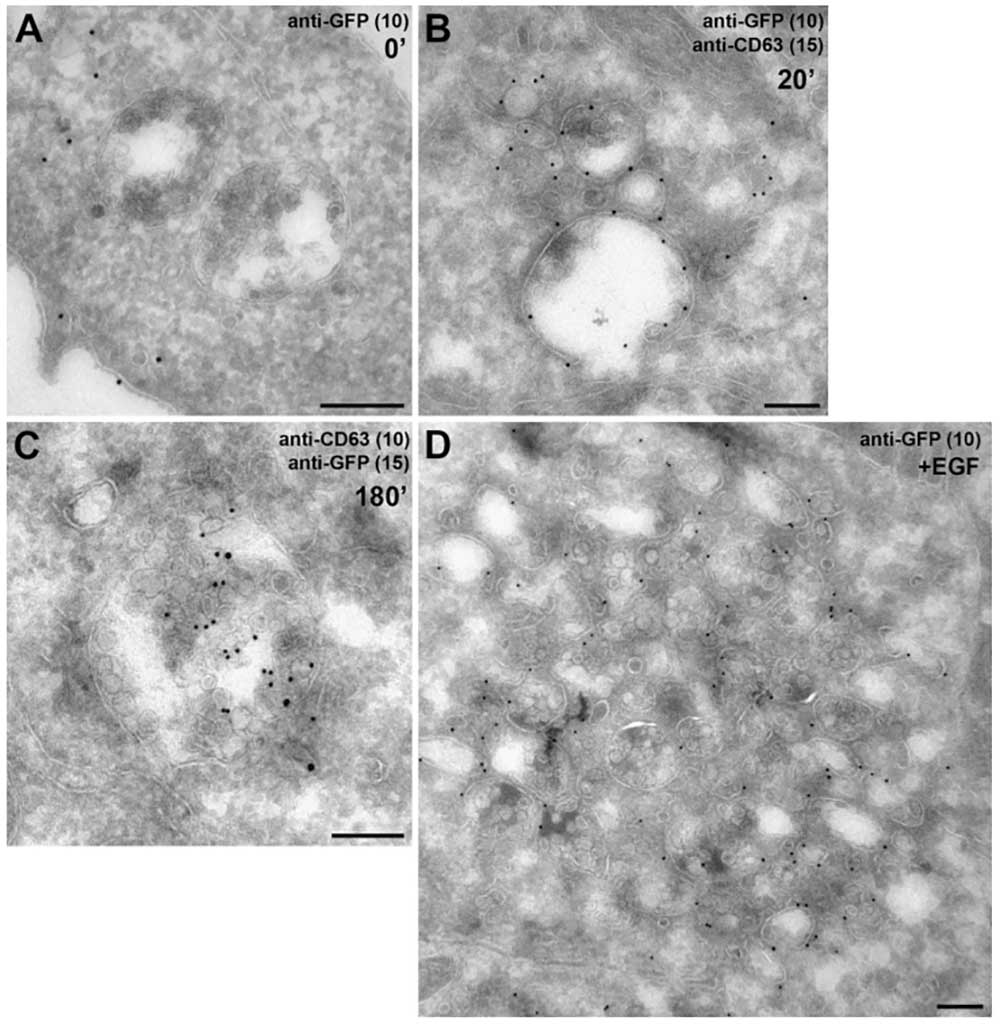We employ two different methods for immunolabelling. The first one involves Cryo embedding, sectioning and labeling, while the second one is pre-embedding labelling where cells are grown on cover slips and the immunolabelling is performed on the whole cells before standard epon embedding.