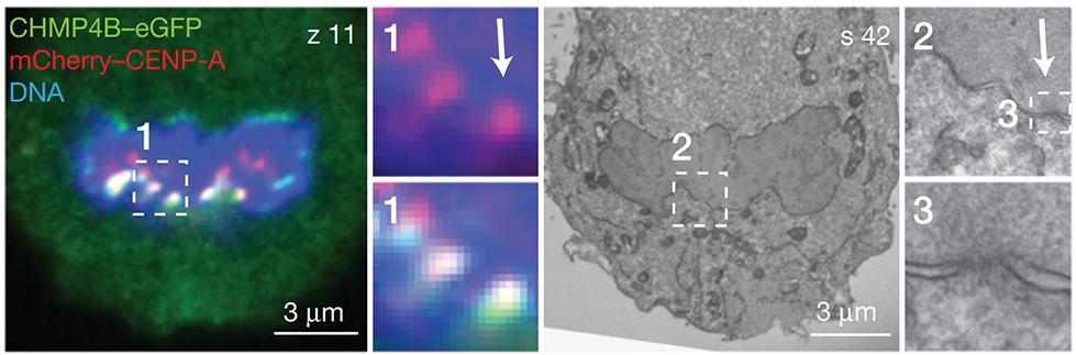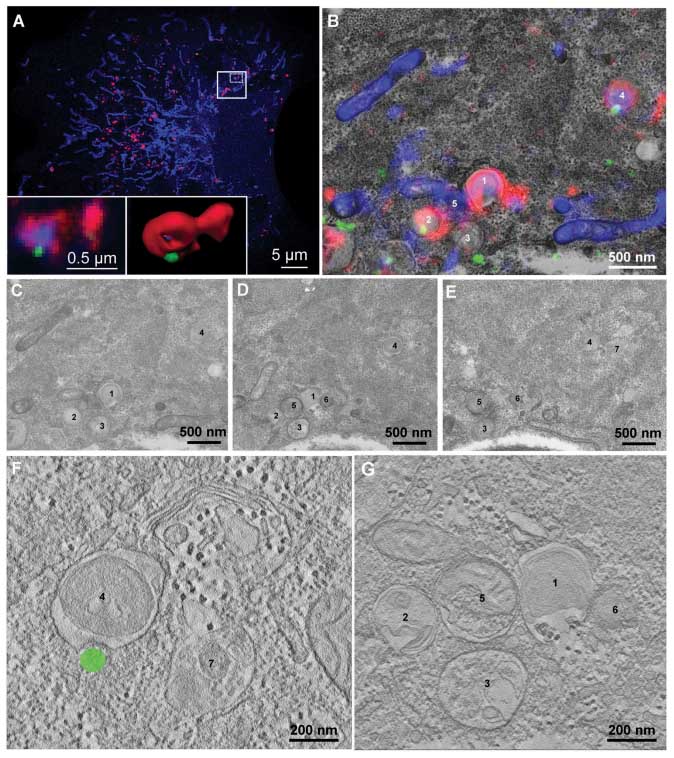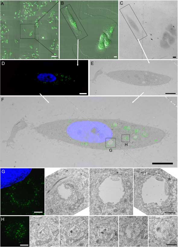 Light microscopy (LM) such as fluorescence microscopy offers the advantage of providing wide-field imaging of dynamic processes in living samples. However, its resolution is limited, and importantly fluorescence microscopy only allows researchers to visualize the specific tags added to the samples and it does not provide structural information to be certain of the localization of this tag to a specific organelle. In contrast, electron microscopy (EM) delivers much higher resolution images, enabling detailed examination of ultrastructural features. However, EM has a more limited field of view and can not be used for live imaging.